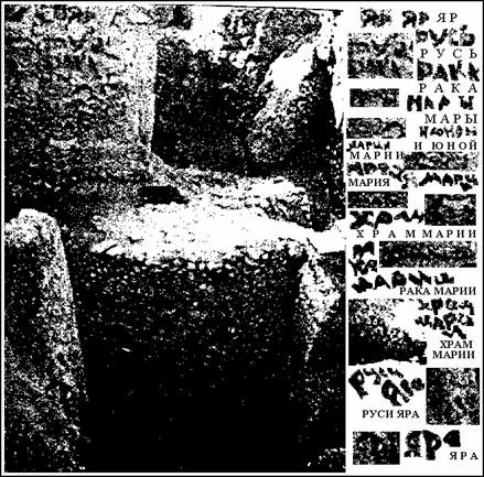 Сначала я рассматриваю надписи на левом плоском камне храма. Сверху здесь читаются слова ЯР, РУСЬ, РАКА МАРЫ, а чуть ниже — И ЮНОЙ МАРИИ. Следовательно, левое помещение представляет собой место, где хранились мощи Мары и девы Марии. Из этого вытекает, что культ девы Марии сложился не в античности, а, по меньшей мере, в период неолита.