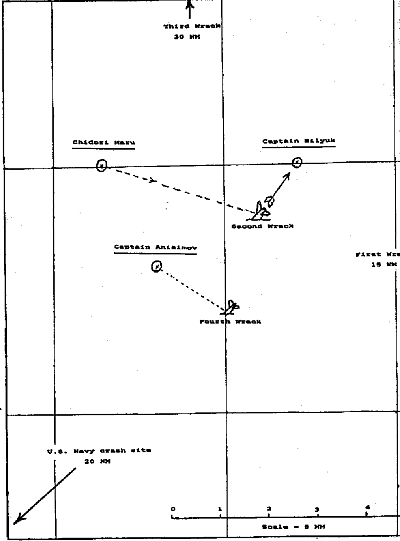Как мы видели, первый остов находился в пределах советских территориальных водах вокруг острова Сахалин (а не Монерон), примерно в 6 морских милях от берега. Второй был найден в международных водах, примерно в 18 милях от Монерона, третий на расстоянии 45 морских миль к северу от этого острова и четвертый примерно в 20 морских милях от него. Ни одно из этих мест не соотносится с 11 морскими милями, упомянутыми Иллешем. Карты JMSA показывают, что Советы искали остов самолета в 11 морских милях от берега в пределах территориальных вод Монерона (а не Сахалина).