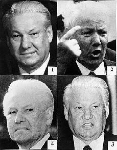 Более того, в последнее время у нас было несколько случаев, когда люди рассматривали детали еще не готовых коллажей и не могли узнать Ельцина по вырезанной из его свежей фотографии физиономии. А раньше узнавали, даже если мы эту физиономию клеили на туловище собаки. Но я совершенно не обратил внимания и на эти факты. Посмотрите на фото 1–4. это что – один и тот же человек?