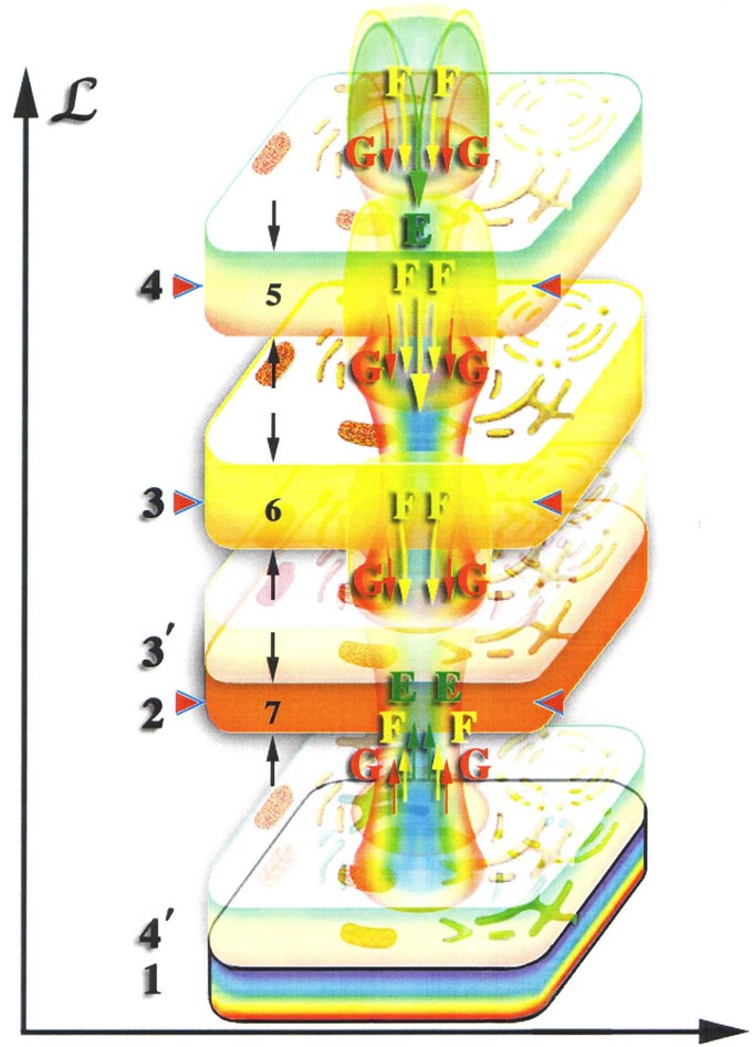 Рис. 175. — проекция четвёртого тела на уровне физической клетки изменяет качественное состояние микропространства на уровне физической клетки. Качественное состояние внутриклеточного пространства изменяется, возникает дополнительное смещение мерности микропространства и во внутреннем объёме спиралей молекул ДНК и РНК. Это дополнительное смещение мерности приводит к тому, что начинают распадаться на первичные материи молекулы, которые ранее сохраняли свою устойчивость. При этом происходит увеличение мощности восходящих потоков первичных материй, создаваемых клеткой в единицу времени. В результате этого увеличивается плотность насыщения восходящими потоками первичных материй всех без исключения тел клетки. Максимально это сказывается на степени насыщения третьего тела клетки в силу того, что на уровне этого тела восходящие потоки первичных материй не успевают рассеяться в значительной степени. И поэтому, плотность насыщения первичными материями третьего тела становится критической и возникает обратный поток первичных материй от третьего тела ко второму. Этот обратный поток создаёт проекцию третьего тела клетки на уровне второго. Проекция третьего тела изменяет качественное состояние микропространства на уровне второго тела клетки. Это, в свою очередь, приводит к большему открытию качественного барьера между вторым и третьим уровнями. При этом уменьшается степень рассеивания восходящих потоков первичных материй на качественных барьерах. И поэтому большая часть восходящих потоков первичных материй достигает соответственно второго, третьего и четвёртого тел клетки. Возрастает плотность насыщения этих тел соответствующими первичными материями и увеличение мощности обратных потоков. Когда мощность обратных потоков станет достаточно большой, они проталкивают проекцию третьего тела клетки на уровень физической клетки. Проекция третьего тела представляет собой гибрид, результат слияния первичных материй G и F и под давлением обратных потоков первичных материй «протекает» через второе тело при некотором сопротивлении.