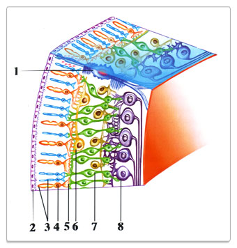 Цветовой сигнал преобразуется в ионный код, который начинает своё путешествие к зрительным зонам мозга. Перераспределение ионов (ионный код) в светочувствительных клетках через контактные зоны (синапсы) вызывает вынужденное перераспределение ионов в так называемых двухполюсных клетках. Двухполюсные клетки аналогичным образом передают изменение своего качественного состояния (возбуждение) ганглиевым клеткам. И далее по волокнам зрительного нерва это электрохимическое возбуждение передаётся нейронам оптических зон коры головного мозга — затылочным и височным. Таким образом по аксонам нейронов, пучок которых и образует зрительный нерв, сигнал в виде перераспределения ионов (ионный код), достигает собственно тела нейрона (см. Рис.71). Любое внешнее воздействие на нервные окончания нейронов нашего тела преобразуется в них в электрохимический сигнал. По нашим нервам «бегают» только ионы, как в одном направлении, так и в другом.