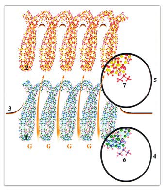 Каким же образом появление дополнительных атомов в молекулярной структуре молекул ДНК приводит к качественному скачку в развитии живой природы? Какая «божественная» трансформация происходит с живой материей при рождении «чуда» памяти и человеческого сознания? Божественная или мистическая дымка вокруг этого «чуда» рассеивается, как утренний туман под лучами восходящего Солнца, и остаётся обнажённое обыкновенное чудо природы... Молекулярная и пространственная структура молекул ДНК такова, и влияние на окружающий их микрокосмос столь существенно, что во внутреннем объёме их спиралей происходит открытие качественного барьера между физически плотным и эфирным уровнями. Причём, подобное открытие качественного барьера не разрушает сами эти молекулы, а только молекулы, попавшие в ловушку при своём движении внутри клетки — внутреннем объёме спиралей молекул ДНК. Уровень собственной мерности во внутреннем объёме этих молекул столь большой, что большинство молекул, попавших в него, становятся неустойчивыми и распадаются на материи, их образующие. Высвободившиеся таким образом первичные материи начинают перетекать на эфирный уровень и создают на нём точную копию как молекул ДНК, так и всей клетки в целом. Отличие заключается в том, что копия создаётся только из одной первичной материи G. Поэтому появление дополнительных цепочек из атомов и молекул ДНК (см. Рис.73) приводит к тому, что у эфирных копий этих молекул появляются тождественные изменения.