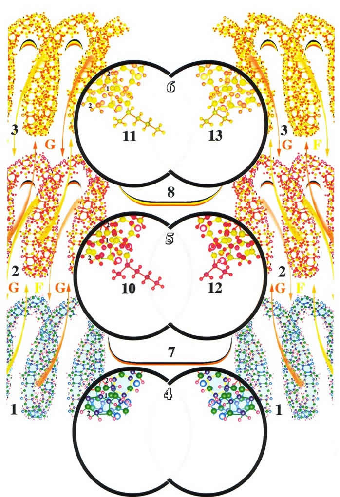 Рис. 93. — два соседних нейрона, на эфирном и астральном уровнях которых имеются отпечатки ионных кодов разных внешних сигналов. Эфирные и астральные структуры этих нейронов не сомкнуты между собой, но каждый отпечаток внешнего сигнала изменяет качественную структуру молекул ДНК или РНК на эфирном и астральном уровнях. При наличии эфирного и астрального отпечатков внешнего сигнала, возникает возможность накопления качественных изменений эфирных и астральных структур молекул ДНК или РНК.